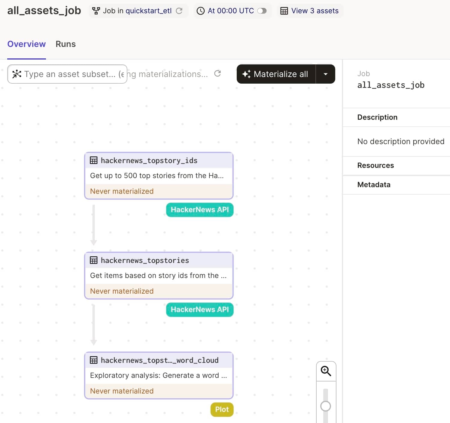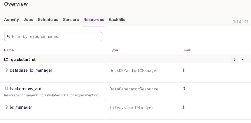 回到 Dagster UI,在 Overview 的 Resources 里,可以看到已经有我们添加的 hackernews_api 了,但是暂时我们还没有修改代码,所以 Uses 是 0。
