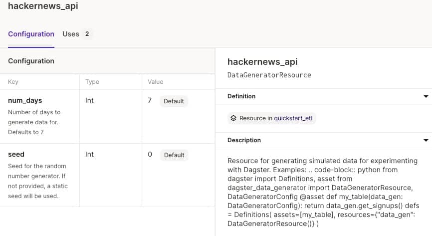 Resource 本身也是可以接收不同的参数用于配置的,比如 hackernews_api 这个 resource 就有 num_days 和 seed 两个参数配置,如下图所示: