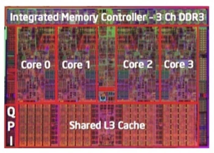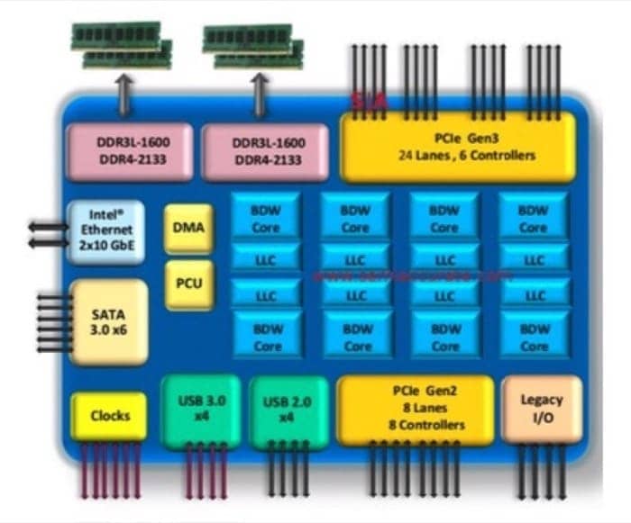 除了增加处理器本身的功能外,另外的趋势是集成,比如说 2015 年的 Core i7 Broadwell,可以从下图看到处理器芯片中加入了原来主板才有的许多部件,如 PCIe, SATA, DDR3 等等。