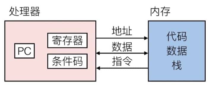 比较一下我们就发现,C 语言代码被处理成了有统一格式的汇编代码,在汇编代码中,第一个字符串叫做操作符,后面可能跟着 1/2/3 个以逗号分隔的操作数,为什么是以这样的形式呢?这就要从处理器的运算方式讲起了,先来看看处理器是如何配合内存进行计算的: