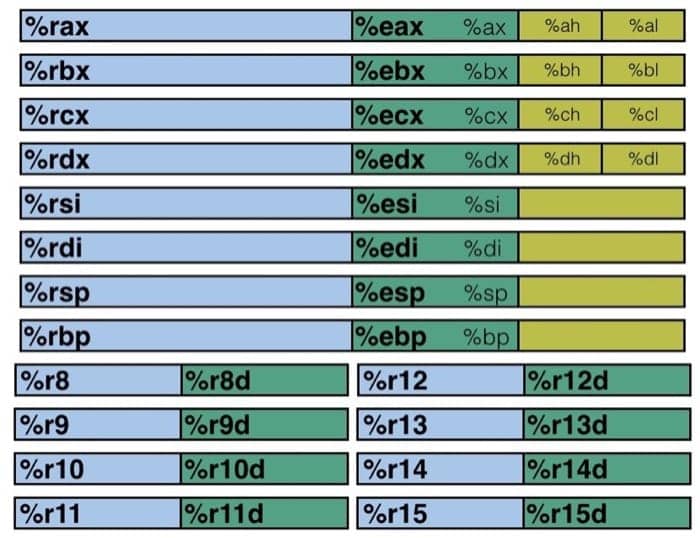 前六个寄存器(%rax, %rbx, %rcx, %rdx, %rsi, %rdi)称为通用寄存器,有其『特定』的用途: