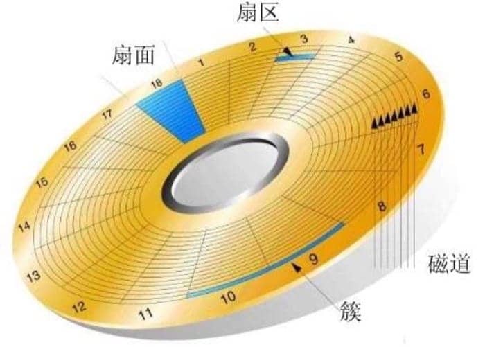 机械硬盘有许多片磁盘(platter)组成,每一片磁盘有两面;每一面由一圈圈的磁道(track)组成,而每个磁道会被分隔成不同的扇区(sector)。这里概念层层递进,可以结合下图仔细辨析清楚。