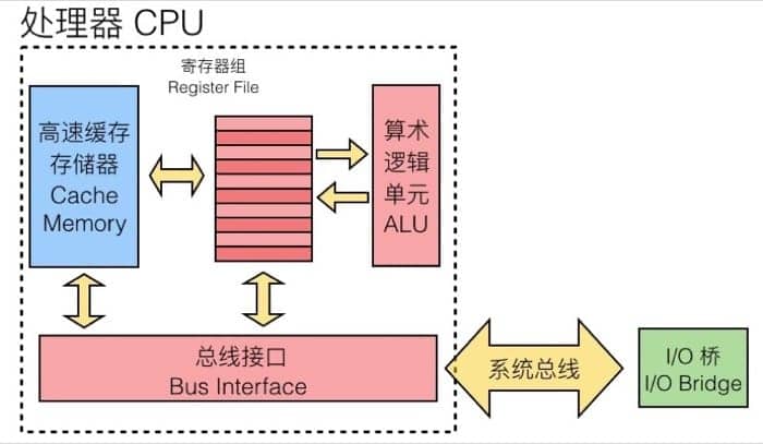 总线是用来传输地址、数据和控制信号的一组平行的电线,通常来说由多个设备共享,类似于不同城市之间的高速公路,可以传输各类数据。CPU 通过总线和对应的接口来从不同的设备中获得所需要的数据,放入寄存器中等待运算,像下面这样: