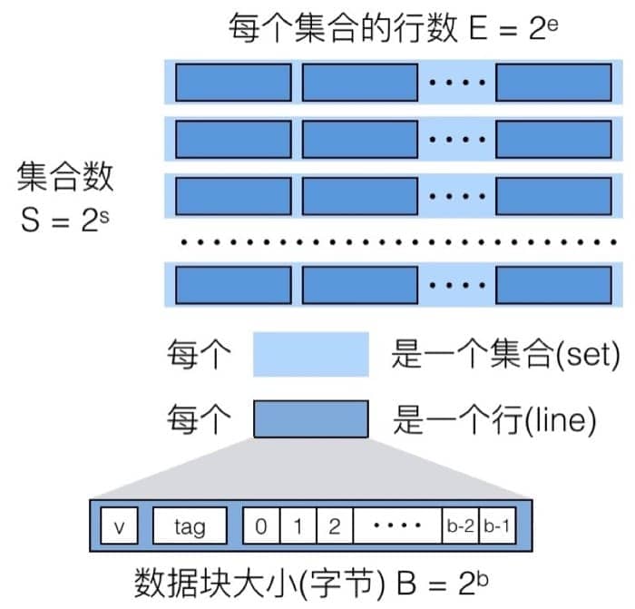 - B 表示每个缓存块(block)保存的字节数目