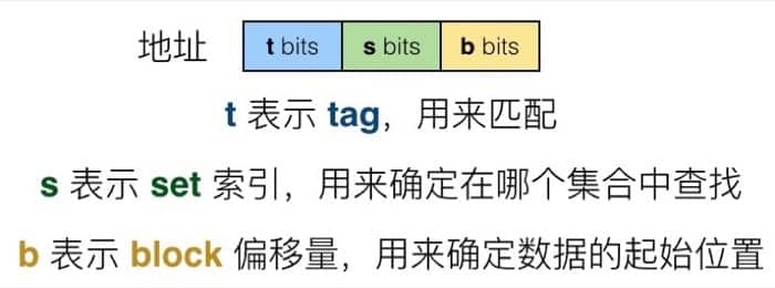 当处理器需要访问一个地址时,会先在高速缓冲存储器中进行查找,查找过程中我们首先在概念上把这个地址划分成三个部分: