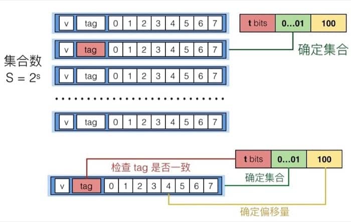 具体在从缓存中读取一个地址时,首先我们通过 set index 确定要在哪个 set 中寻找,确定后利用 tag 和同一个 set 中的每个 line 进行比对,找到 tag 相同的那个 line,最后再根据 block offset 确定要从 line 的哪个位置读起(这里的而 line 和 block 是一个意思)。