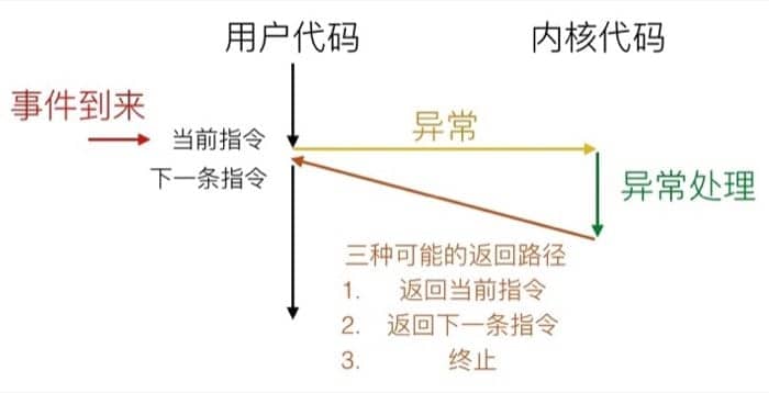 这里的异常指的是把控制交给系统内核来响应某些事件(例如处理器状态的变化),其中内核是操作系统常驻内存的一部分,而这类事件包括除以零、数学运算溢出、页错误、I/O 请求完成或用户按下了 ctrl+c 等等系统级别的事件。