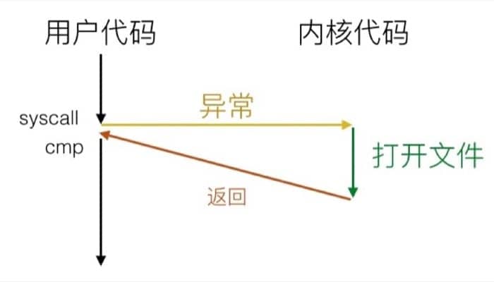 举个例子,假设用户调用了 open(filename, options),系统实际上会执行 __open 函数,也就是进行系统调用 syscall,如果返回值是负数,则是出错,汇编代码如下: