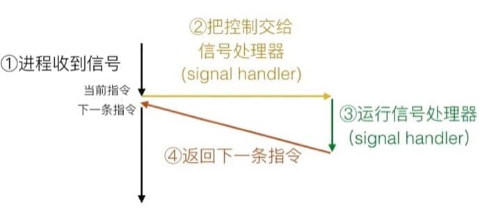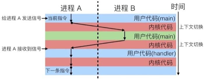 信号处理器的工作流程可以认为是和当前用户进程『并发』的同一个『伪』进程,示意如下:
