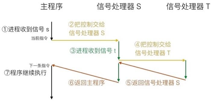 还有一个需要注意的是,信号处理器也可以被其他的信号处理器中断,控制流如下图所示: