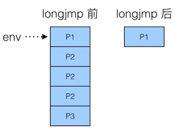 因为 P2 在跳转的时候已经返回,对应的栈帧在内存中已经被清理,所以 P3 中的 longjmp 并不能实现期望的操作。