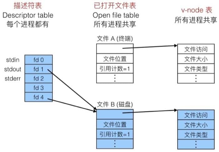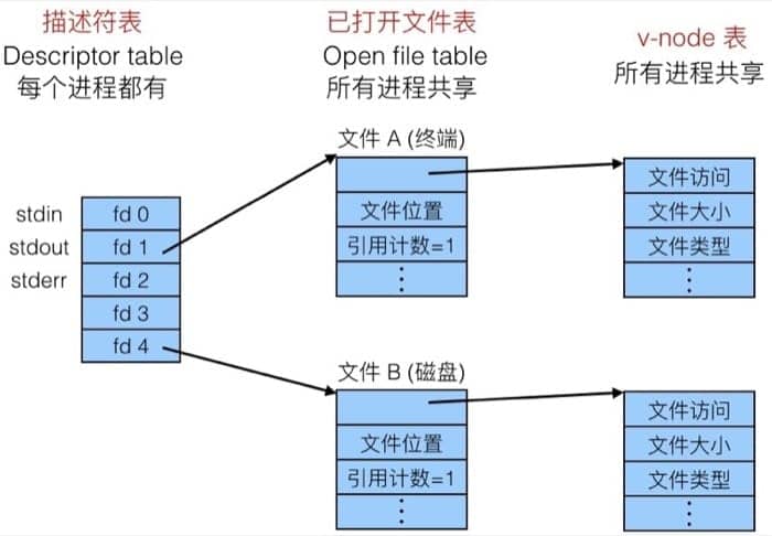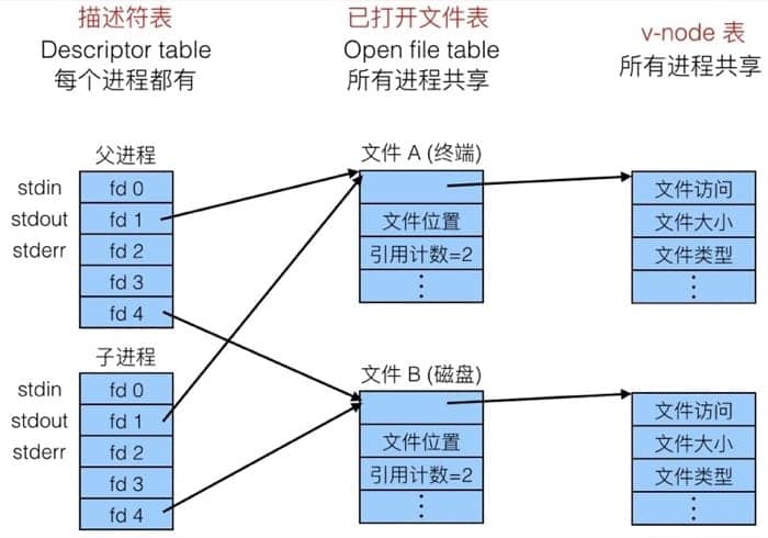 这里有一个需要说明的情况,就是使用 fork。子进程实际上是会继承父进程打开的文件的。在 fork 之后,子进程实际上和父进程的指向是一样的,这里需要注意的是会把引用计数加 1,如下图所示