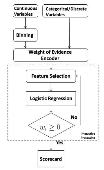 传统评分卡模型的流程图如下,这里注意各个系数都需要大于等于 0。传统方法中,通常采用 variance inflation factor(VIF) 或 correlation matrix 来保证系数非负: