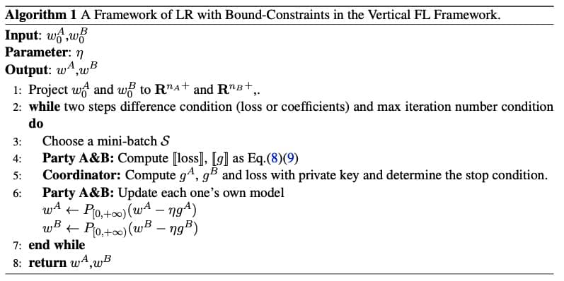 大数据和人工智能在风控领域有很多应用,如信用评分。在数据隐私保护越来越被重视的今天,我们针对传统评分卡提出了一种纵向联邦学习算法,算法基于 logistic regression with bounded contrains,命名为 FL-LRBC。最终得到的模型将只有正的系数,与此同时可以无需花费时间调整参数。FL-LRBC 算法在引入更多数据后可以有效增加 AUC 和 KS,并且已经应用在实际的商业场景中。(注:因为纵向联邦学习会引入新的特征,这个特征只要区分度够高,实际上肯定是会带来 AUC 和 KS 的大幅提升的,所以我们要关注其到底是如何划分数据和特征的。)