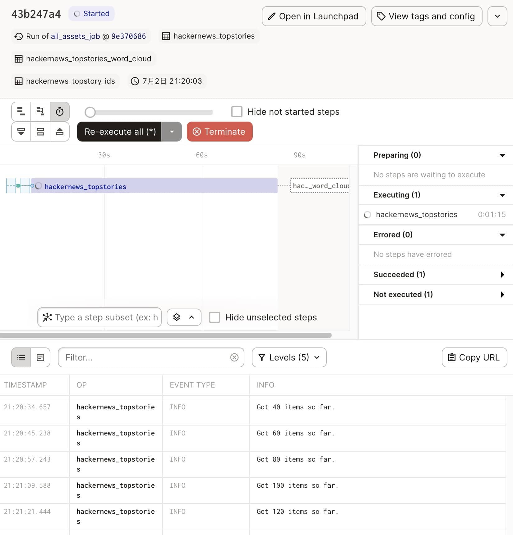 当我们想要执行这个工作流的时候,实际上我们就是要把这些具体的资产进行物化(Materialize),点击上图的黑色 Materialized All 按钮,就会发起一次运行(Run),我们可以在本次运行的查看页面看到具体的进展: