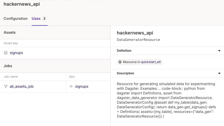 回到 Dagster UI,在 Overview 的 Resources 里,可以看到已经有我们添加的 hackernews_api 了,但是暂时我们还没有修改代码,所以 Uses 是 0。