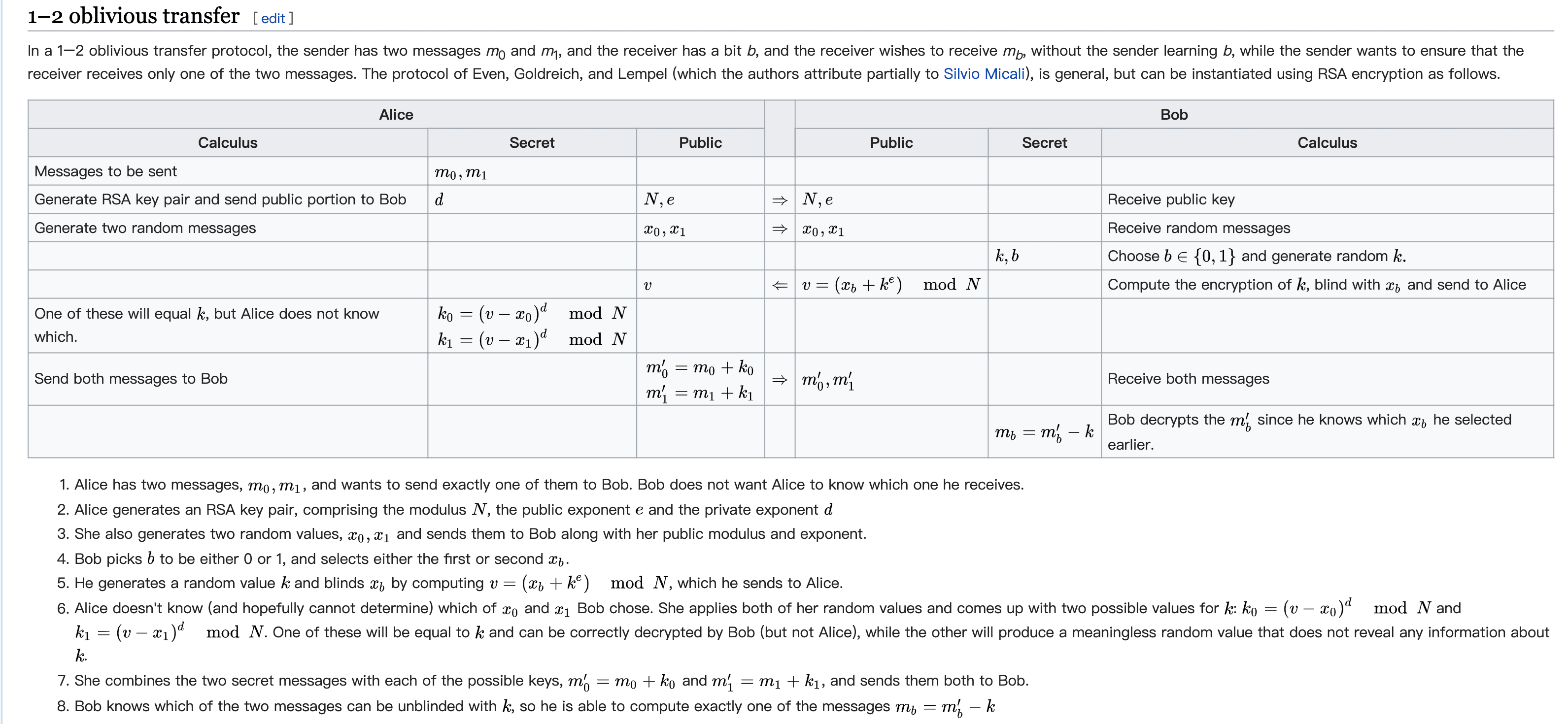 这里我们重点关注第三步,因为 Alice 没办法区分 k0, k1 到底哪个是 Bob 生成的随机数,所以没办法知道 Bob 到底能够获取 m0 还是 m1。而对于 Bob 来说,因为没有私钥,所以也没办法解密另外一条数据。